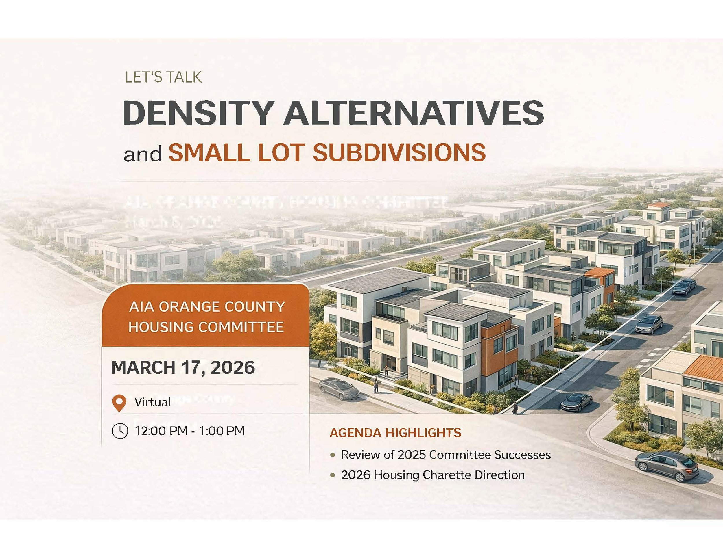 AIAOC 2026 Housing Committee Kick-off Meeting Tuesday, March 17, 2026 12:00 PM 1:00 PM AIA Orange County 1981 Orchard Drive Newport Beach, CA, 92660 United States (map) Google Calendar ICS REGISTER NOW